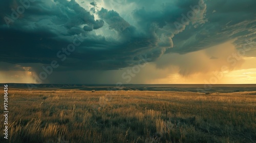 © TheWaterMeloonProjec, Obraz premium Dark clouds delivering intense rainfall over the vast open fields.