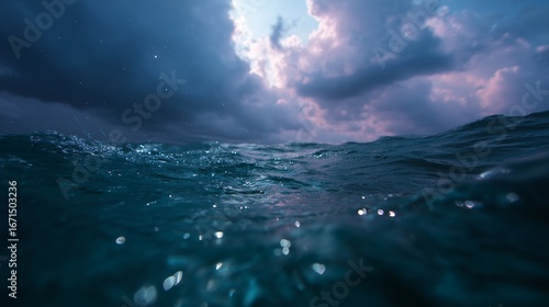 Fototapeta premium Dark clouds gather over the ocean as waves ripple beneath a dramatic sky, creating an atmospheric landscape at twilight