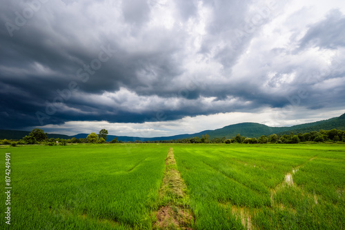 Naklejka premium Dark clouds going low over the green rice fields, rainy season in Thailand