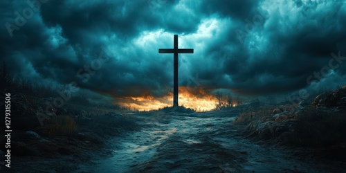 Naklejka premium Dark clouds hover over a solitary cross with glowing light in the background...