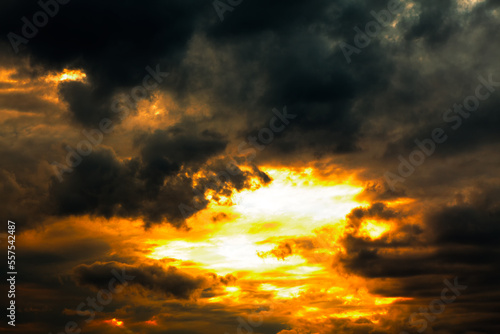 Fototapeta premium Dark clouds with glowing sun . Weather before storm