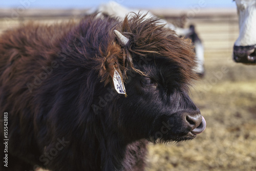 © Виктория Любченко, Fototapeta premium Dark coated calf with fluffy fur in the barnyard