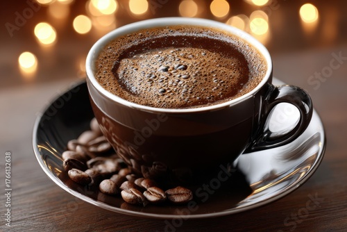 © YouraPechkin, Fototapeta premium Dark Coffee Cup with Beans and Festive Lights