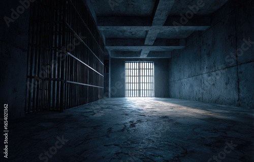 © Tasman, Obraz premium Dark, concrete prison cell interior with a window