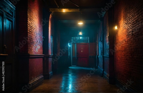 © Royalty-Free, Fototapeta premium Dark corridor with doors, perspective, ergency lighting
