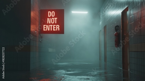 © PaulShlykov, Obraz premium Dark corridor with fog and a warning sign against entering the area at a deserted building