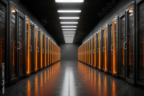 Fototapeta premium Dark corridor with rows of illuminated server racks, showcasing modern data center technology and digital infrastructure, symbolizing technological advancement and connectivity