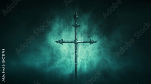 Naklejka premium Dark Cross, Mystical Gothic Cross, Teal Smoke Background