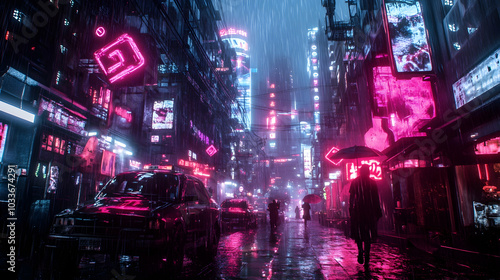 Obraz premium Dark cyberpunk city street illuminated by neon lights, creating a moody...