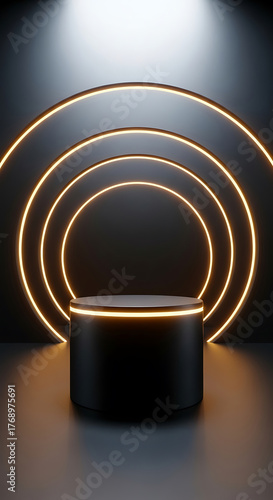 Obraz premium Dark cylindrical platform with glowing orange neon rings in a circular...
