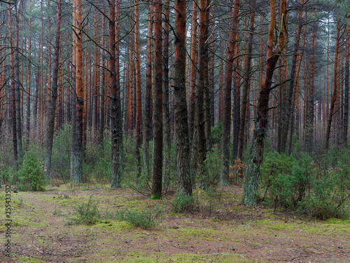 Fototapeta premium dark dense pine forest. tree trunks and shrubs