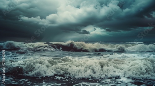 Naklejka premium Dark dramatic sea waves under heavy storm clouds, cinematic moody ocean...