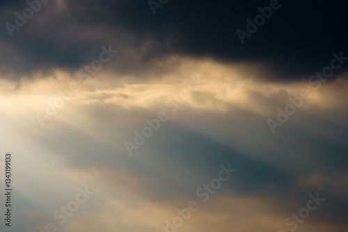 Obraz premium dark dramatic sky at sunset with sun rays through the clouds