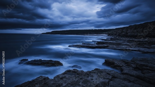 Obraz premium Dark dramatic storm clouds gather over a rocky coastline with rough ocean...