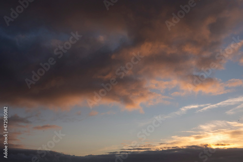 Fototapeta premium Dark dramatic sunset cloudy sky. Nature background. Warm and cool tone.