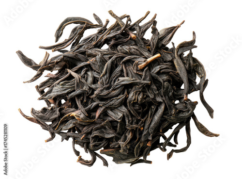 © Dimas, Obraz premium Dark, dried leaves, possibly tea leaves, form a textured, circular heap against black backdrop