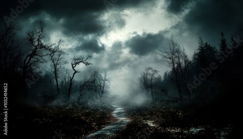 © Panuwat, Fototapeta premium Dark eerie scene forest night sky filled clouds Raster illustration of spooky