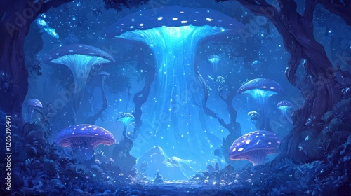 Fototapeta premium Dark enchanted forest with eerie twisted trees, glowing mushrooms, and a...