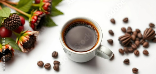 Fototapeta premium Dark espresso in small ceramic cup, white background, aroma, product...