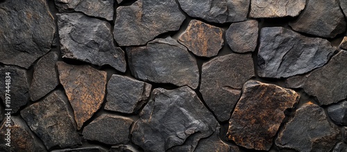 Fototapeta premium Dark Faceted Stone Wall with Varied Textures and Shadows, Ideal for Text...