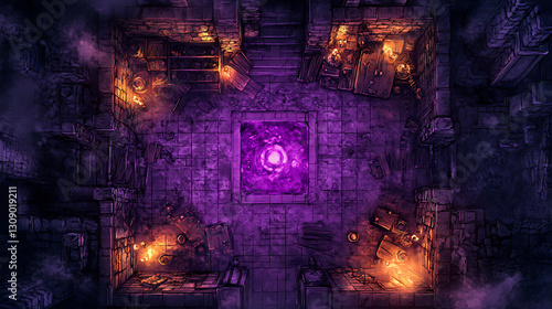© Haki, Obraz premium Dark Fantasy Battle Map: Glowing Purple Core Amidst Burning Ruins