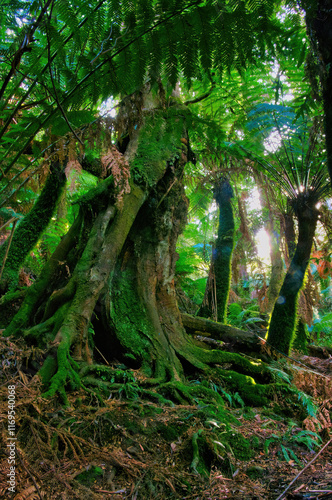 © HansWismeijer, Fototapeta premium Dark fantasy forest with moss-covered roots and tree trunk, and giant ferns