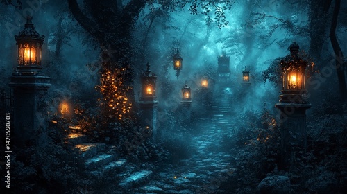 Naklejka premium Dark fantasy horror background with glowing lanterns, tombstones, and haunted...
