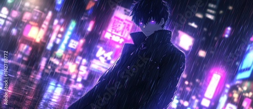 Fototapeta premium Dark figure in rain-soaked alley surrounded by neon lights at night in an...
