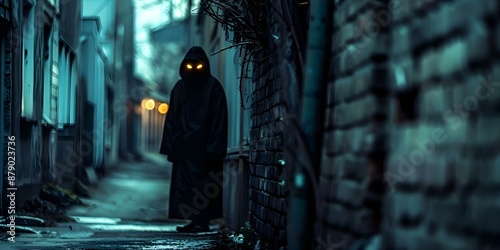 Obraz premium Dark figure with glowing eyes in alley eerie vibe comic book style. Concept...