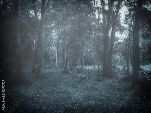 © chatchaiphoto, Fototapeta premium dark foggy forest at dusk