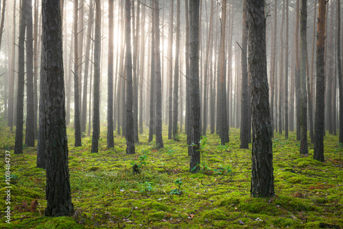 © Piotr Krzeslak, Fototapeta premium dark foggy pine forest with moss