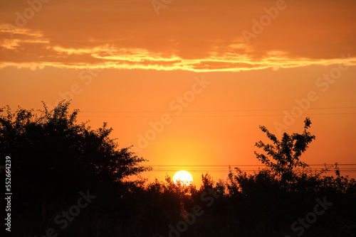 Obraz premium Dark foliage of small trees and bush against bright colorful sunset sky with...