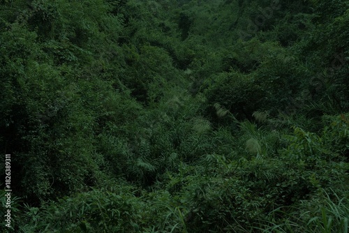 Fototapeta premium Dark forest background in Danxia Mountains (Danxiashan) in Shaoguan, Guangdong Province, China.