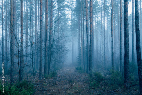 Obraz premium Dark forest covered with fog