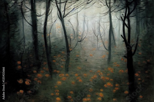 Obraz premium Dark forest in autumn fog. High quality illustration