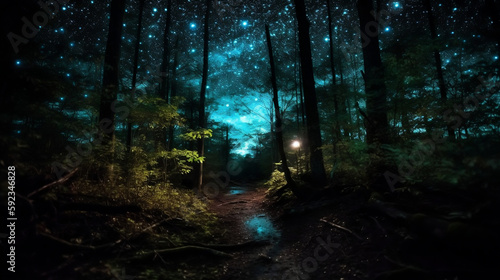 Fototapeta premium Dark forest, Neon circuitry, Star-filled sky, Bright, Futuristic. Generative AI.