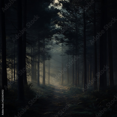 Naklejka premium Dark Forest Path at Night Mysterious Fog, Light Beams, and Tall Trees