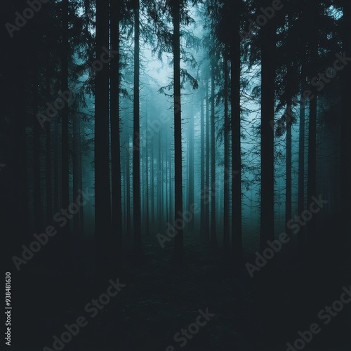 © Narongsag, Obraz premium Dark Forest Path Misty Trees in the Woods