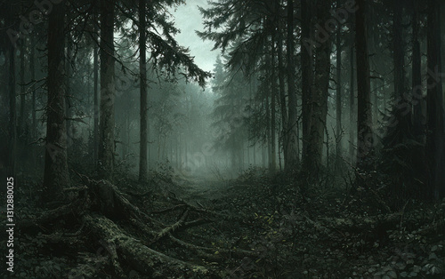 © creatfive, Obraz premium Dark Forest Path Shrouded in Mist