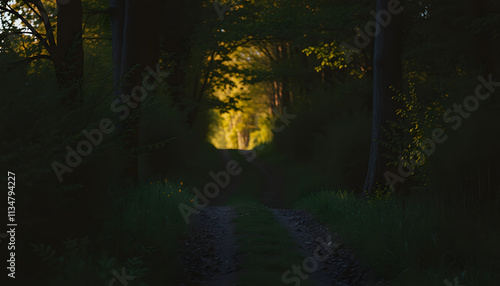 Fototapeta premium Dark Forest Path with Sunlight: Mysterious forest road bathed in golden...