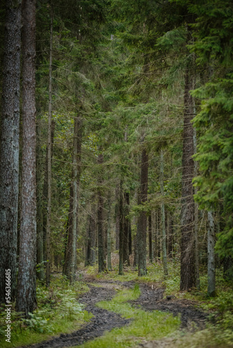 Obraz premium Dark forest roads. Light in the forest tunnel