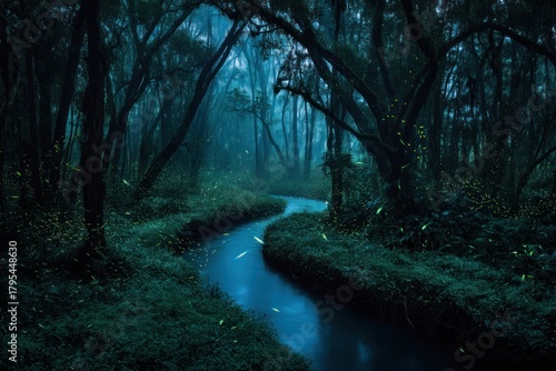 © LyceeChee, Obraz premium Dark forest scene with winding river and atmospheric lighting illustration