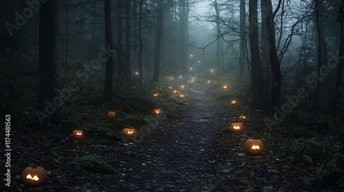 Fototapeta premium Dark forest trail lined with glowing pumpkins and eerie mist