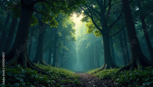 Naklejka premium Dark forest with a massive hole in the canopy above it, tree, hole, nature