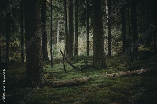 © Алекс Осипова, Obraz premium dark forest with broken trees, dark green woods thicket