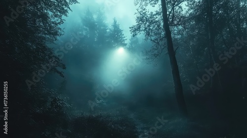 Fototapeta premium Dark forest with mysterious light beam penetrating fog