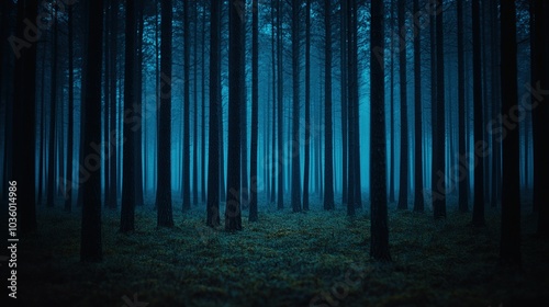 Naklejka premium Dark forest with tall trees and misty atmosphere.