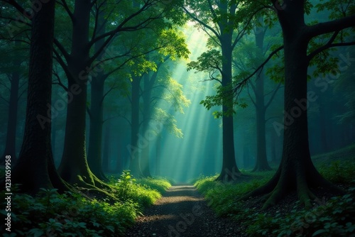 © tpadobestock, Obraz premium Dark forest with tall trees and overhanging branches, dense foliage, towering trees