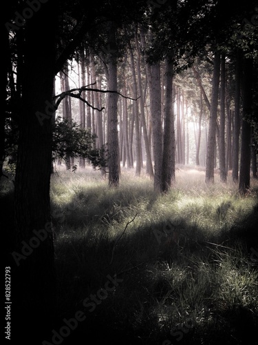 Obraz premium dark forest with tall trees in the middle and the sun coming through the clouds
