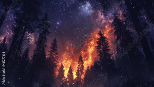 Fototapeta premium dark forest with tall trees is illuminated by vibrant fire, while sky is filled with stars, creating dramatic and mystical atmosphere